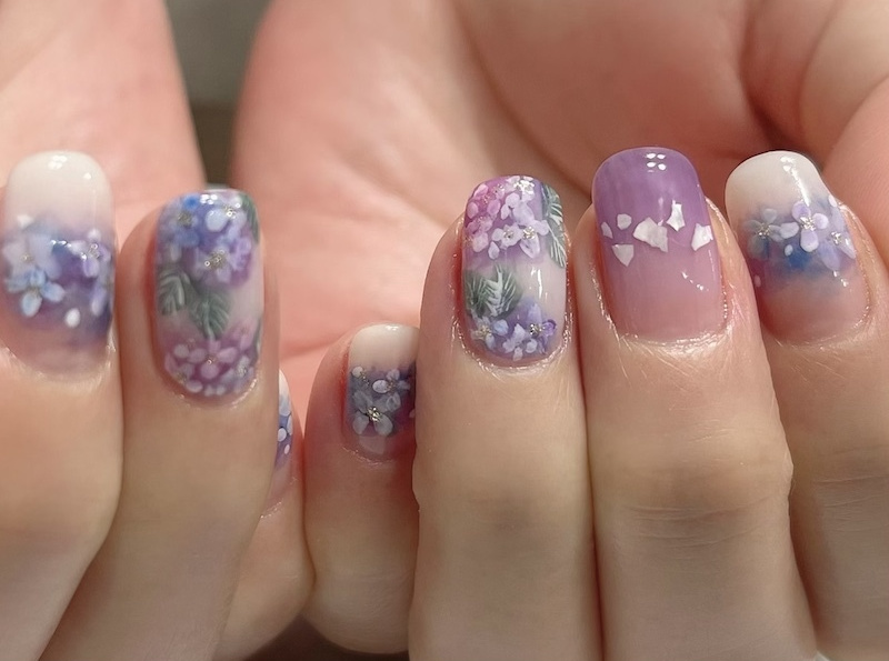紫陽花カラーのシェルを埋め込んだ涼しげなネイルは6月に人気です